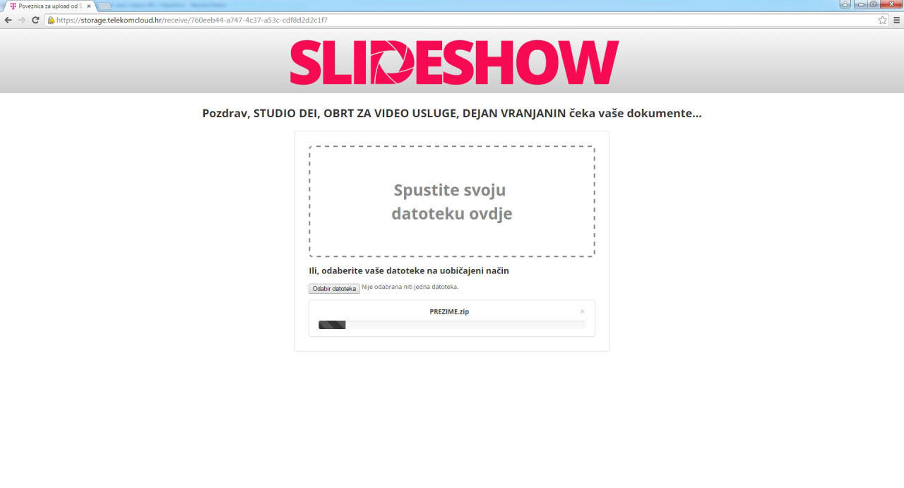 Slanje fotografija za izradu Slideshowa prilično je jednostavno. Nakon što popunite i pošaljete narudžbu za Slideshow koji želite naručiti, na e-mail koji ste naveli u narudžbi stići će vam potvrda primitka narudžbe i poseban sigurni link za upload fotografija. Kako bismo klijentima osigurali što brži i sigurniji upload, koristimo se uslugom Hrvatskog Telekoma - Cloud Storage. To znači da smo na serveru HT-a zakupili poseban prostor za našu tvrtku, i da svaki vaš upload sigurno stiže upravo tamo gdje je namijenjen - na naš virtualni disk.